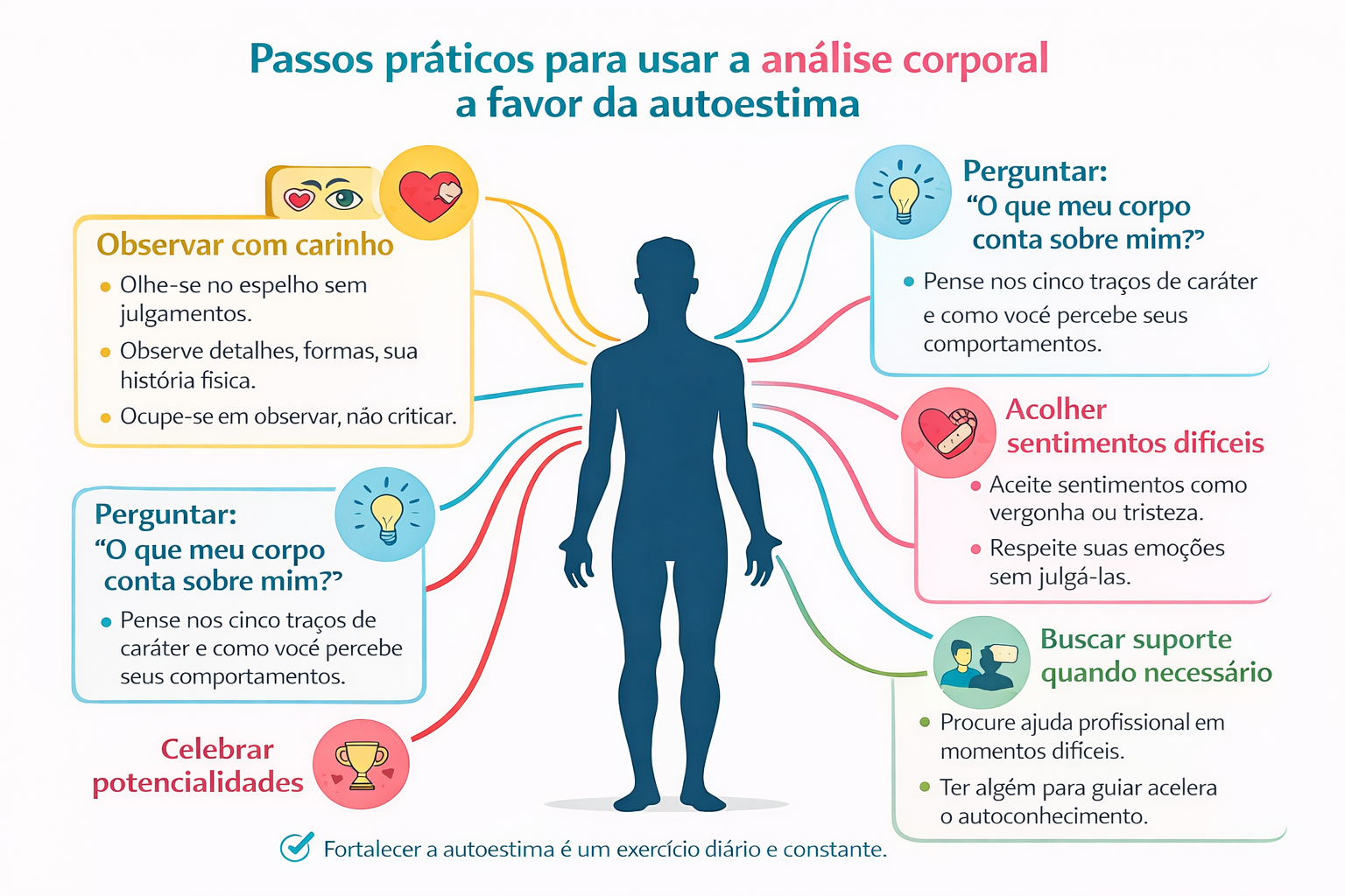 Por meio da análise corporal, posso entender melhor meus padrões automáticos, reconhecer a origem de inseguranças e valorizar meus pontos fortes. Esse processo me ajuda a parar de me comparar, acolher sentimentos difíceis e criar atitudes baseadas em respeito próprio. O resultado é uma autoestima menos dependente de aprovação externa e muito mais sólida.